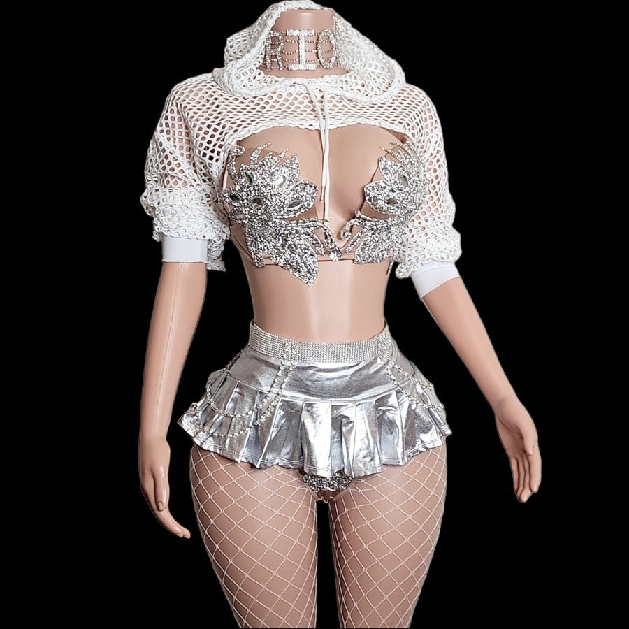 - Choose the 6pc set for a complete look that includes a fishnet hoodie, tights, and a metallic mini pleated skirt. Necklace not included