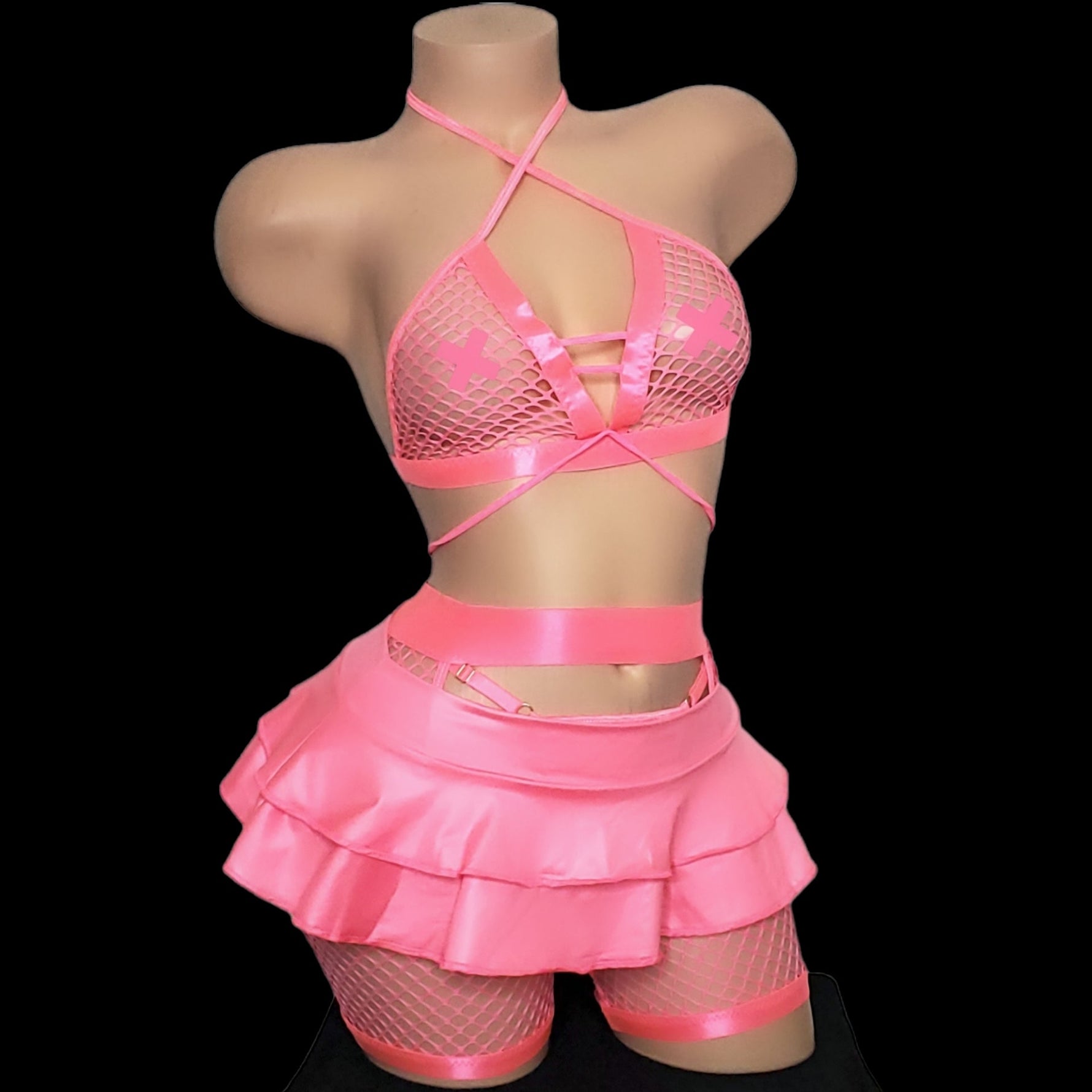 - 4pc set includes fishnet bralette, mini chaps, thong and mini skirt