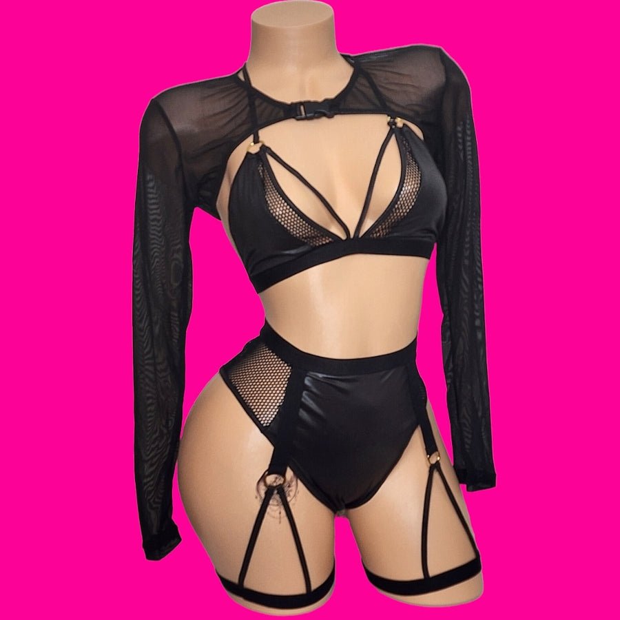 Show off in this a sexy 2pc set with a faux/ netted bikini style bralette and matching high waist bottom ft. a unique garter straps with an attached leg bands are sure to make you stand out of the crowd! Unleash your inner diva and rave in style!